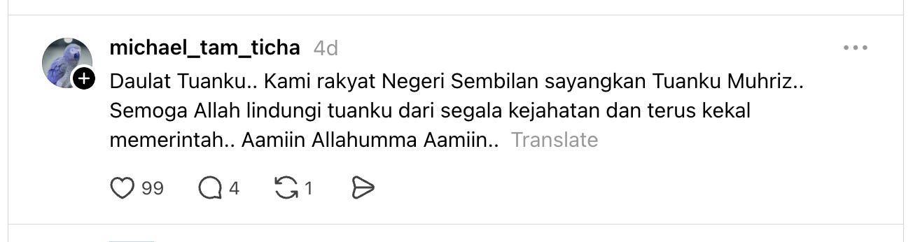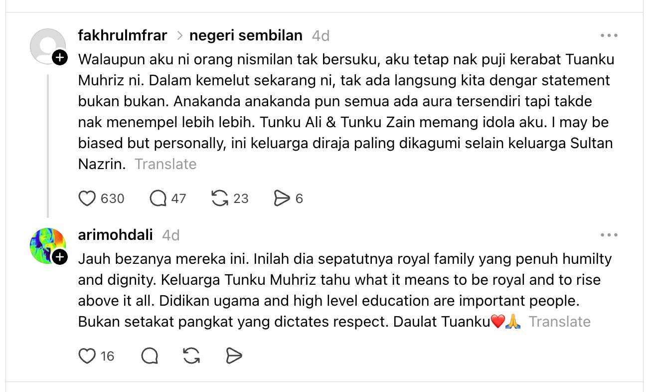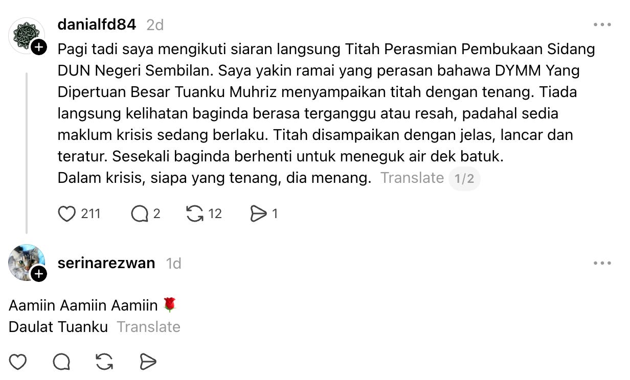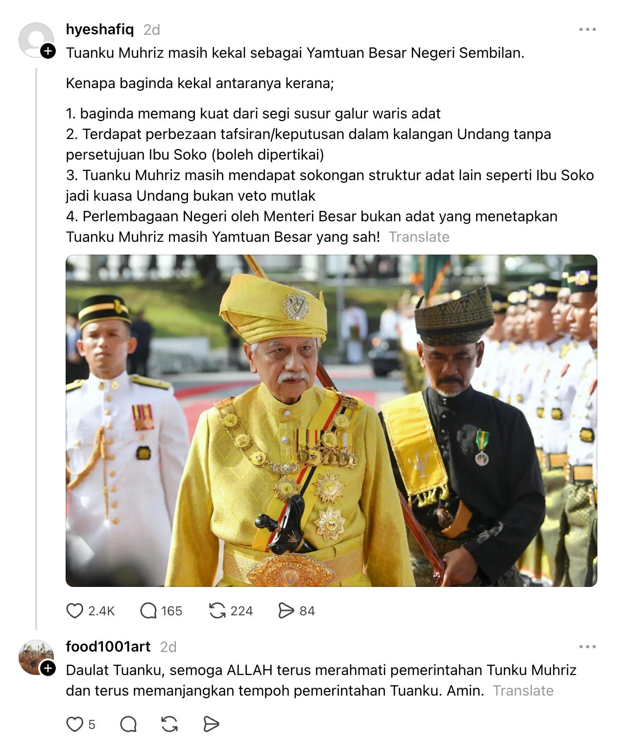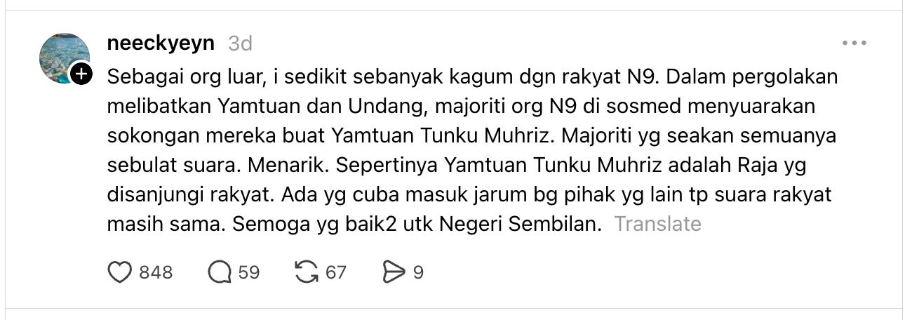 [Translation: “As an outsider, I am somewhat amazed by the people of N9. In the turmoil involving the Yamtuan and the Undang, the majority of N9 people on social media are voicing their support for Yamtuan Tunku Muhriz. A majority that seems to be unanimous. Interesting. It seems that Yamtuan Tunku Muhriz is a ruler who is cherished by the rakyat. There are those who try to insert needles for the other side but the voice of the rakyat remains the same. May all be well for Negeri Sembilan.”]
