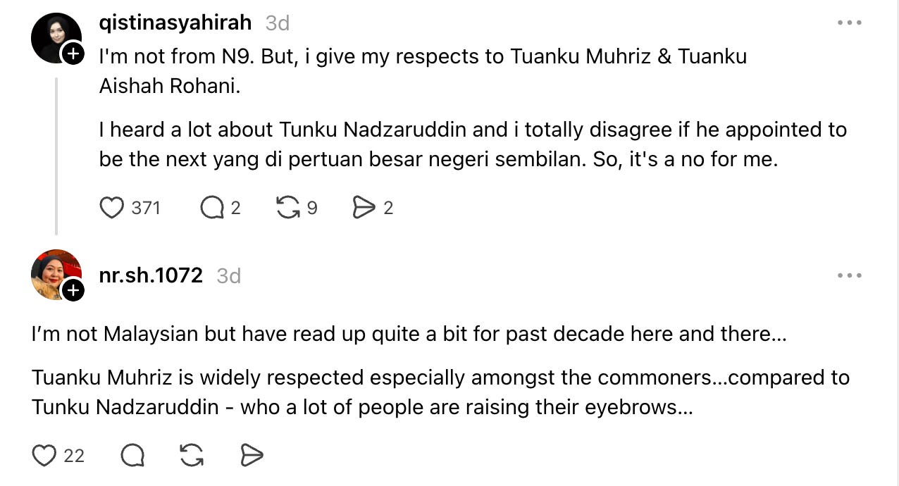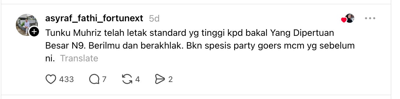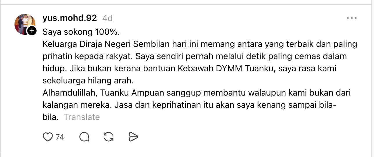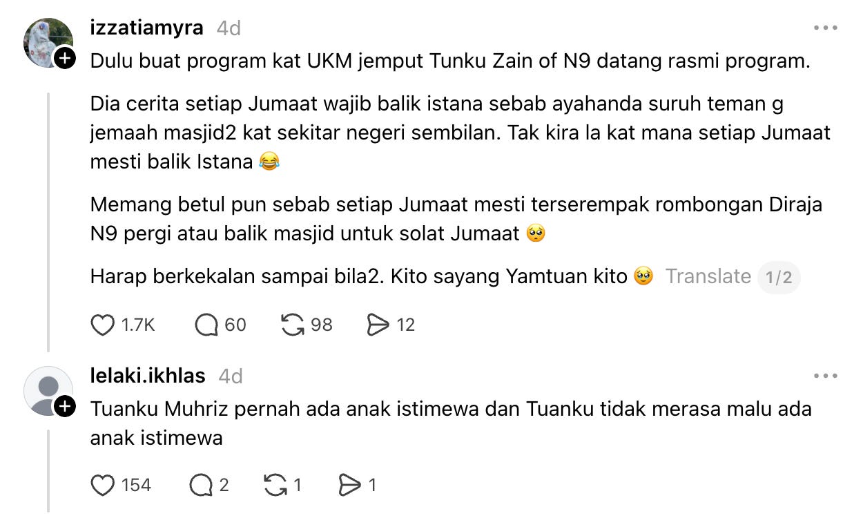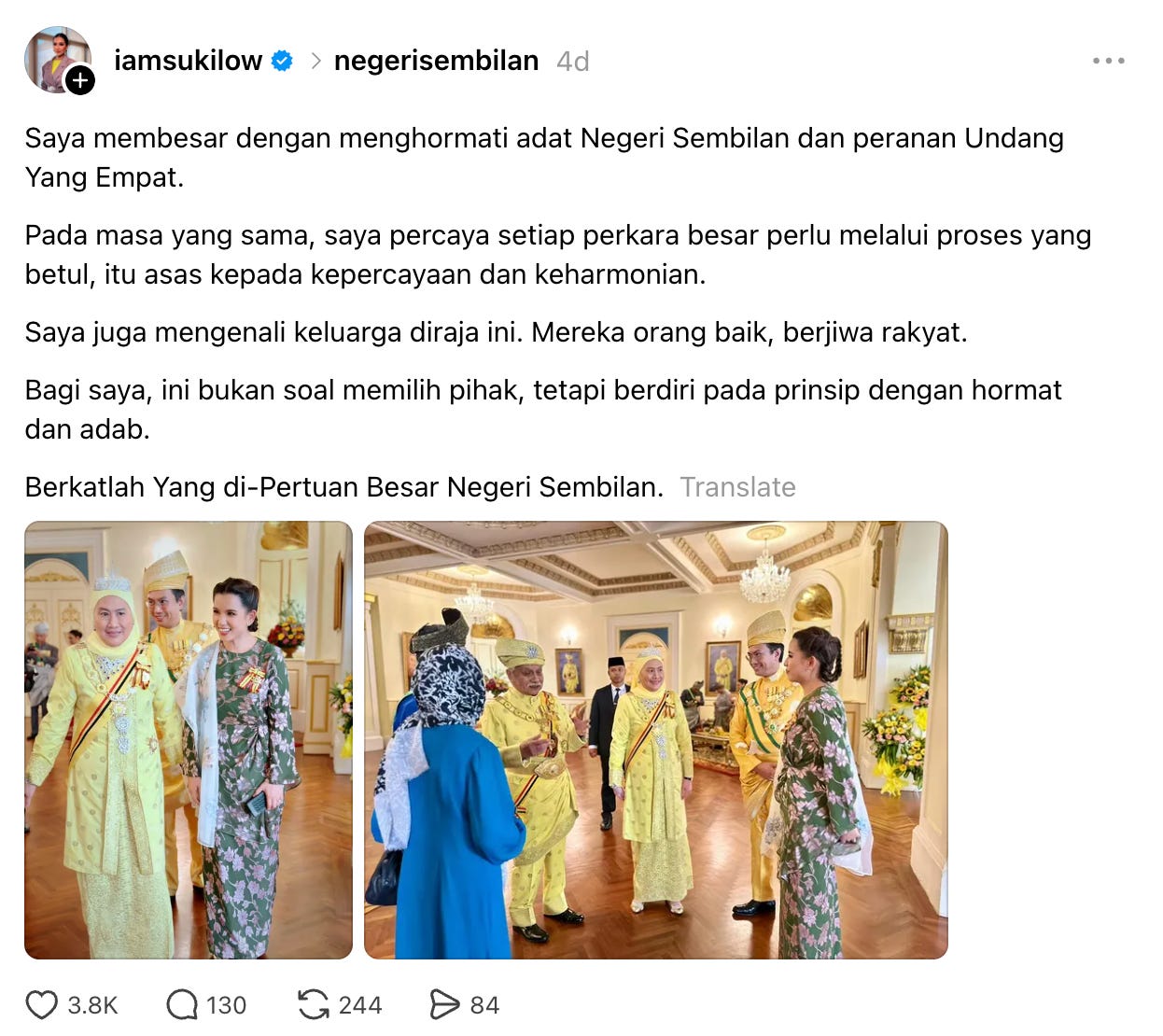 [Translation: “As an outsider, I am somewhat amazed by the people of N9. In the turmoil involving the Yamtuan and the Undang, the majority of N9 people on social media are voicing their support for Yamtuan Tunku Muhriz. A majority that seems to be unanimous. Interesting. It seems that Yamtuan Tunku Muhriz is a ruler who is cherished by the rakyat. There are those who try to insert needles for the other side but the voice of the rakyat remains the same. May all be well for Negeri Sembilan.”]