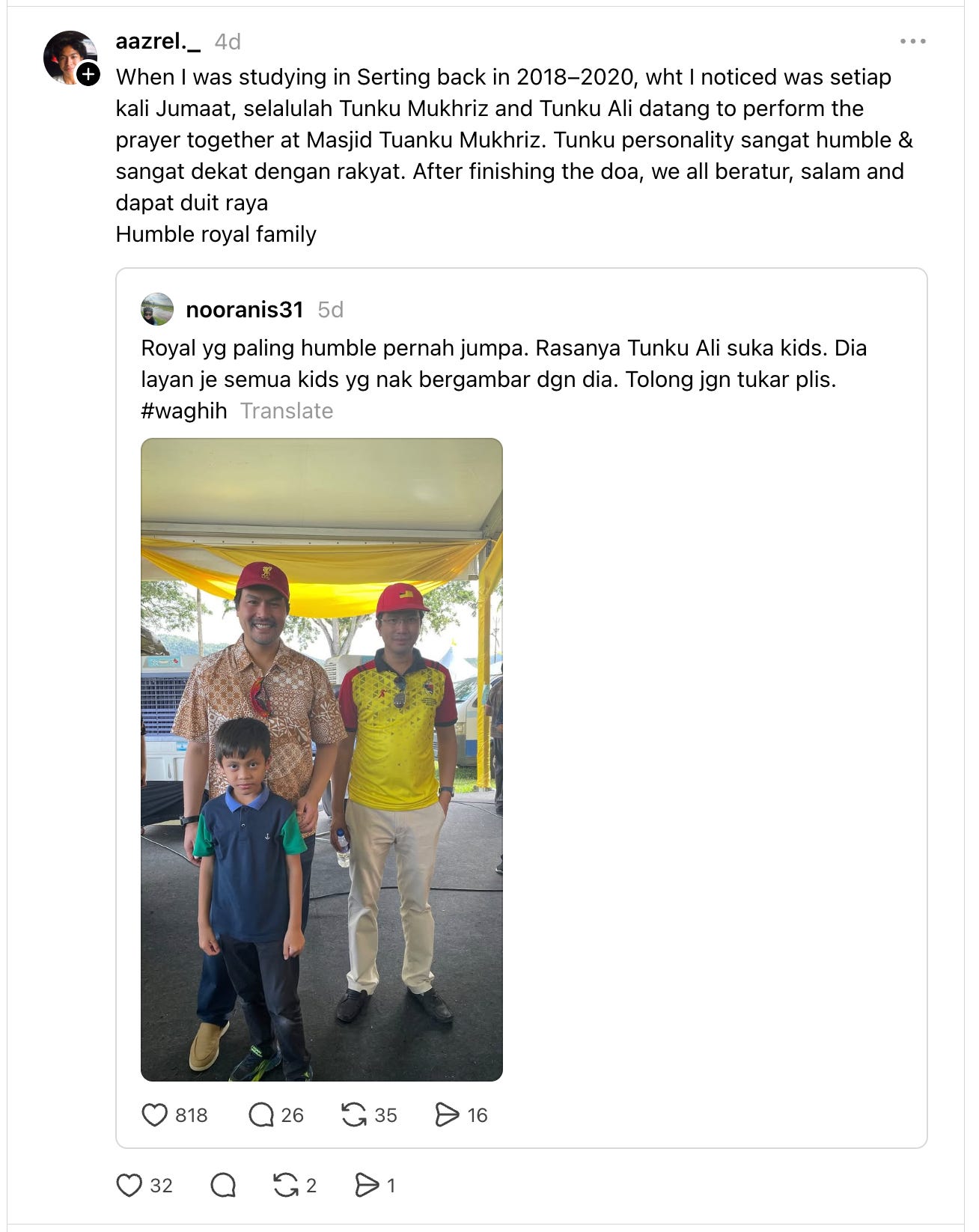 “When I was studying in Serting back in 2018–2020, what I noticed was that every Friday, Tuanku Muhriz and Tunku Ali would always come to perform prayers together at Masjid Tuanku Muhriz. Their personality is very humble and very close to the rakyat. After finishing the doa, we all lined up, shook hands and received duit raya.