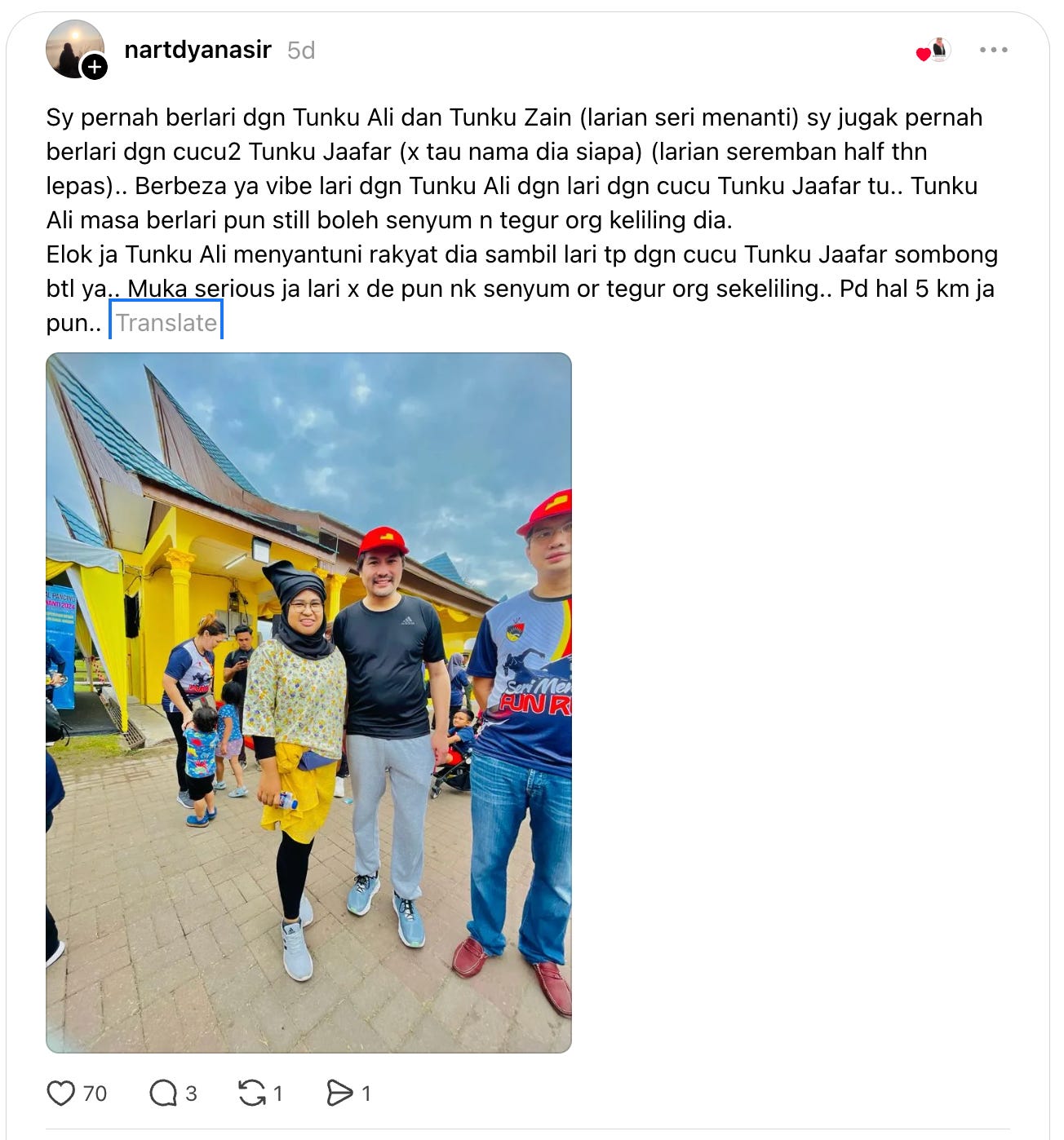 [Translation: “I have run with Tunku Ali and Tunku Zain (Seri Menanti run) and I have also run with Tuanku Ja’afar’s grandchildren (I don’t know their names) (Seremban half run last year).. Very different vibe running with Tunku Ali compared to running with Tuanku Ja’afar’s grandchildren.. Tunku Ali even while running can still smile and greet the people around him.