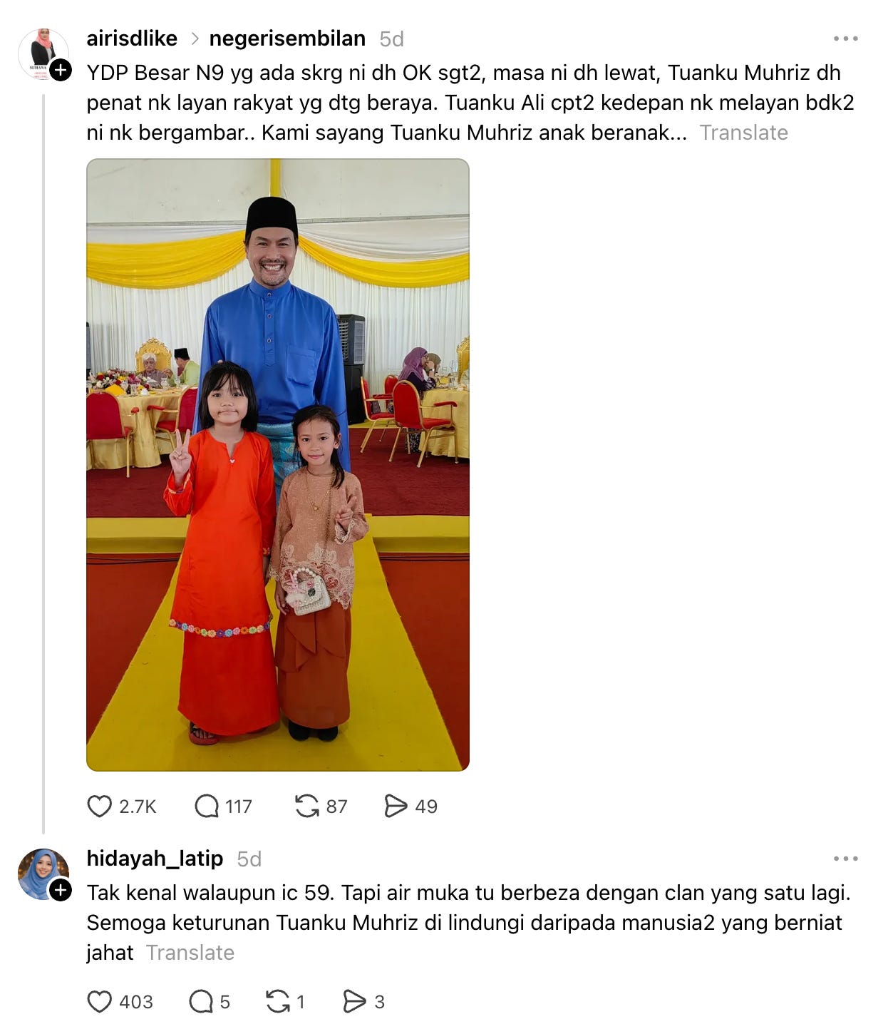“The current YDP Besar of N9 is already very OK, this moment has passed, Tuanku Muhriz was already tired from entertaining the rakyat who came to visit during Raya. Tunku Ali quickly stepped forward to entertain the children who wanted photos.. We love Tuanku Muhriz and his children...”
