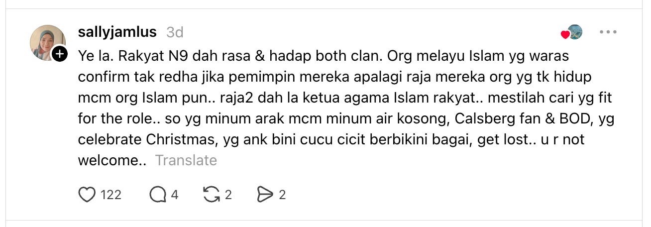 [Translation: "Yes indeed. The people of N9 have already experienced and dealt with both clans. Sensible Malay Muslims will definitely not accept if their leaders, let alone their rulers, are people who don't live like Muslims.. rulers are already the head of Islam for the people.. they must find someone fit for the role.. so those who drink alcohol like drinking plain water, Carlsberg fans and BOD (Board of Directors — implying corporate party lifestyle), those who celebrate Christmas, those whose wives, children, grandchildren and great-grandchildren wear bikinis and such — get lost.. you are not welcome.."]
