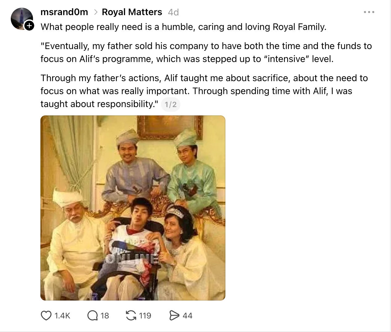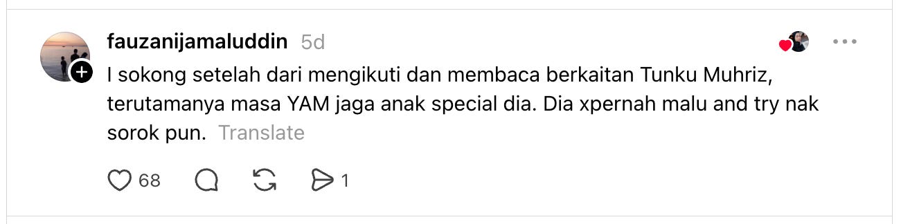 [Translation: "I give my support after following and reading about Tunku Muhriz, especially when YAM looked after his special needs child. He was never embarrassed and never tried to hide it."]