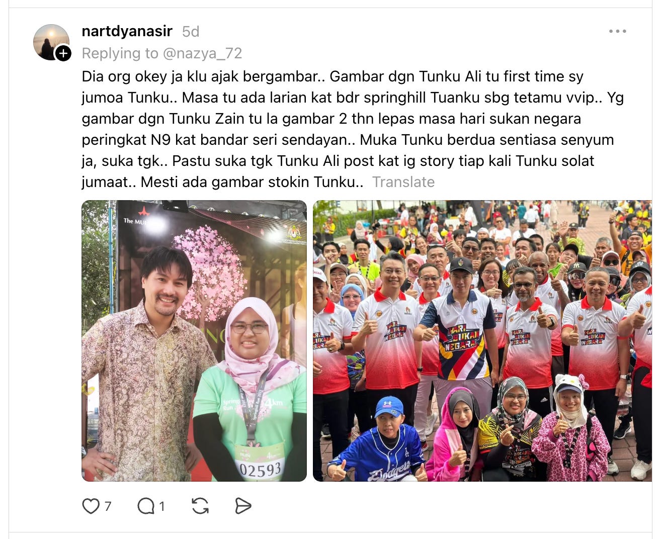 [Translation: "He's a totally fine person if you ask to take a photo with him.. The photo with Tunku Ali was the first time I met Tunku.. At that time there was a run at Springhill, Tuanku was there as a VVIP guest.. The photo with Tunku Zain was taken 2 years ago during the National Sports Day at state level in Bandar Seri Sendayan.. Both Tunku's faces are always smiling, love seeing them.. And I love seeing Tunku Ali post on his IG story every time he performs Friday prayers.. There's always a photo of Tunku's socks.."]