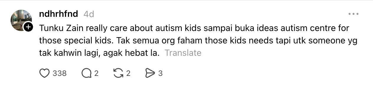 [Translation: "Tunku Zain really cares about autism kids — he even opened an IDEAS autism centre for those special kids. Not everyone understands those kids' needs, but for someone who isn't even married yet, that's quite remarkable."]