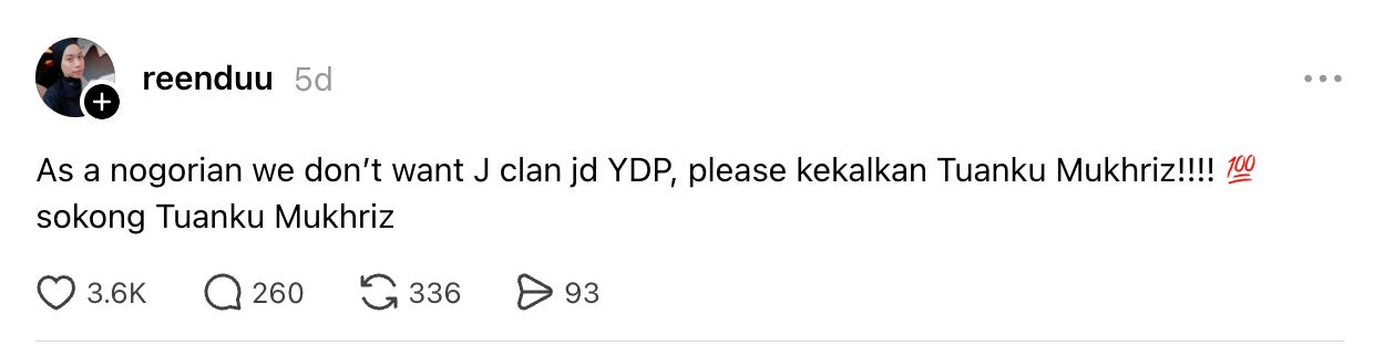 [Translation: “As a Nogorian we don’t want J clan to become YDP, please keep Tuanku Muhriz!!!! 💯 support Tuanku Muhriz”]
