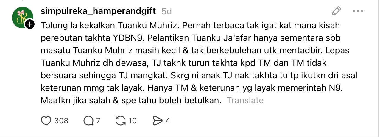 [Translation: "Please keep Tuanku Muhriz. I once read somewhere — I don't remember where — the story of the battle for the YDBN9 throne. The appointment of Tuanku Ja'afar was only temporary because at the time Tuanku Muhriz was still young and not capable of ruling. After Tuanku Muhriz became an adult, TJ did not want to step down to TM and TM did not say anything until TJ passed away. Now TJ's children want the throne but following their original lineage they are simply not eligible. Only TM and his lineage are eligible.]
