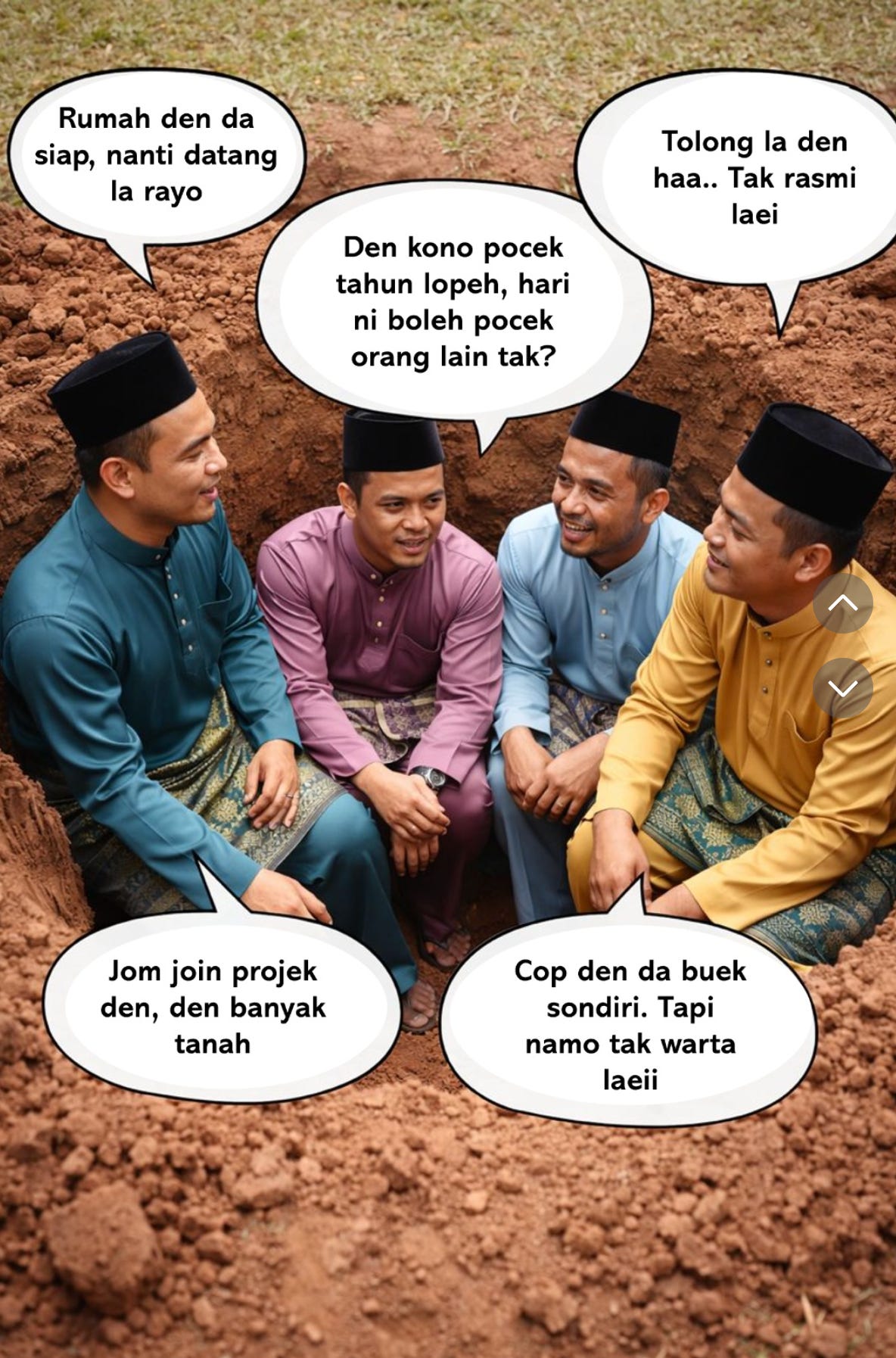 This is a brilliant Nogori dialect meme mocking the four Undang. Four men sitting in a hole in the ground (symbolising they’ve dug their own grave). Here’s the translation: